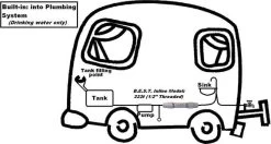 Theย ‘T’ย unit { T is for 1/2″ย Threaded and is for installation on internal pipe work} is a DIY Installation for a handyman.ย It can be installed inline, anywhere on a the internal plumbingย AFTER THE PUMP.ย The unit is supplied with bare threads due to the numerous different pipes available for RV’s.ย The filter is supplied standard with mounting brackets to support the unit.