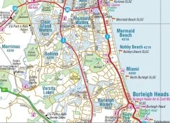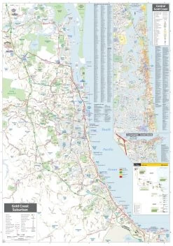 This map of the Gold Coast includes detailed mapping of the city (1:15,000) and suburbs (1:50,000), as well as a comprehensive overview of the surrounding Gold Coast Hinterland (1:100,000).