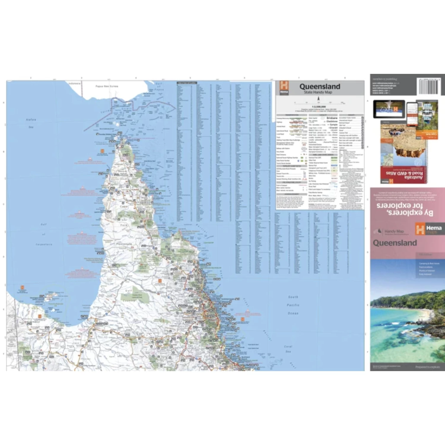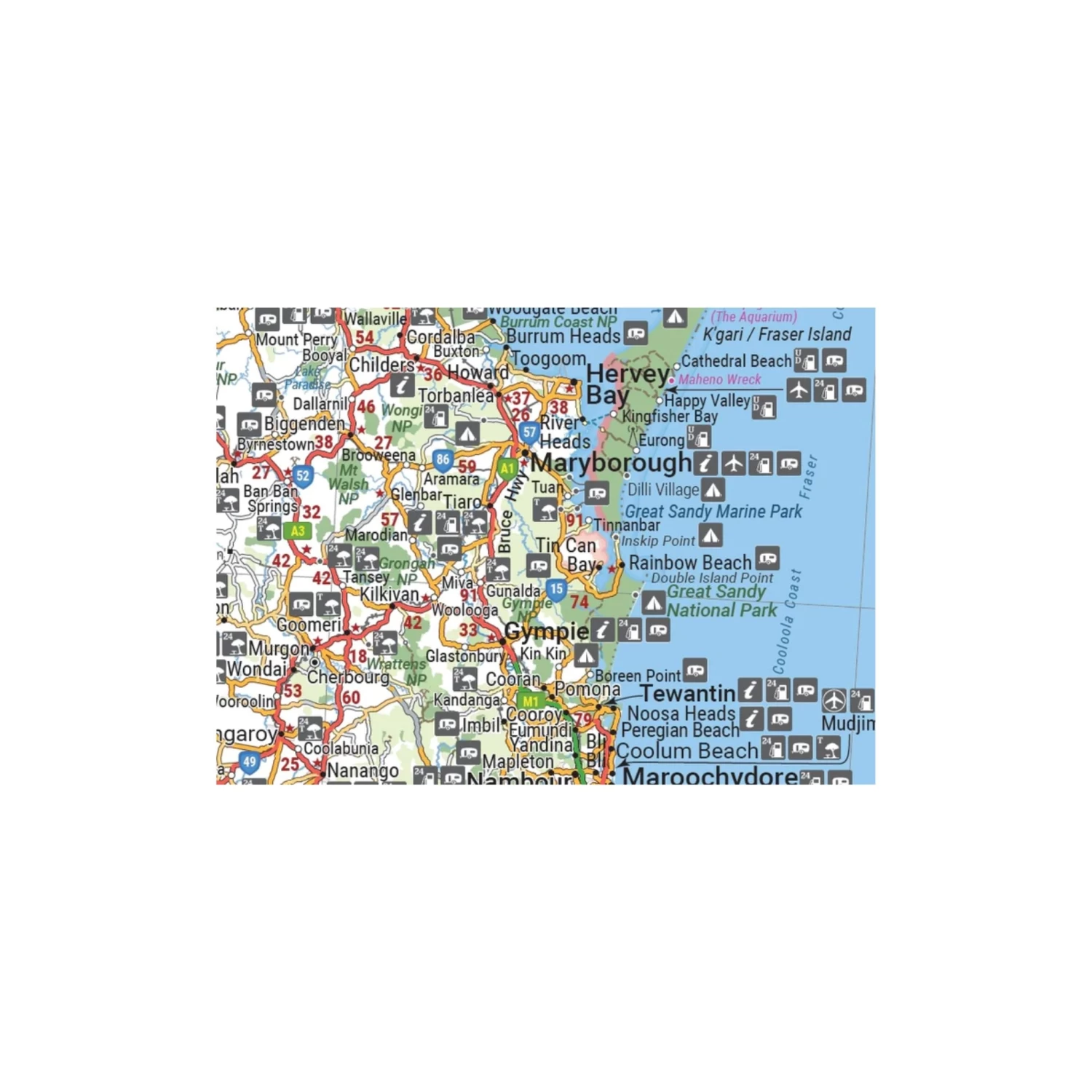A compact map of Queensland (QLD) at a scale of 1:2,500,000 for touring throughout the state which features highways, major roads and minor roads. Marked on the map are national parks, camping areas, caravan parks, rest areas, points of interest and 24-hour fuel accompanied by a distance grid and an index.