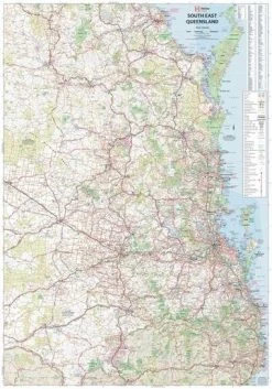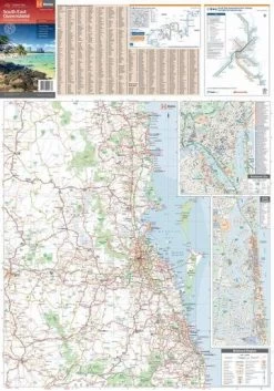 A regional map of South East Queensland (1:500,000) that stretches from the New South Wales-Queensland border to past Bundaberg, with maps of the Brisbane Region (1:300,000), Brisbane City and the Gold Coast on the opposite side.