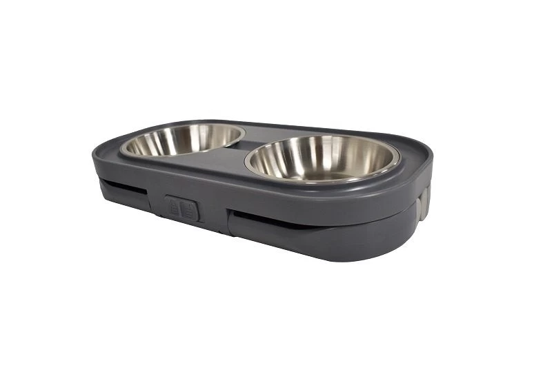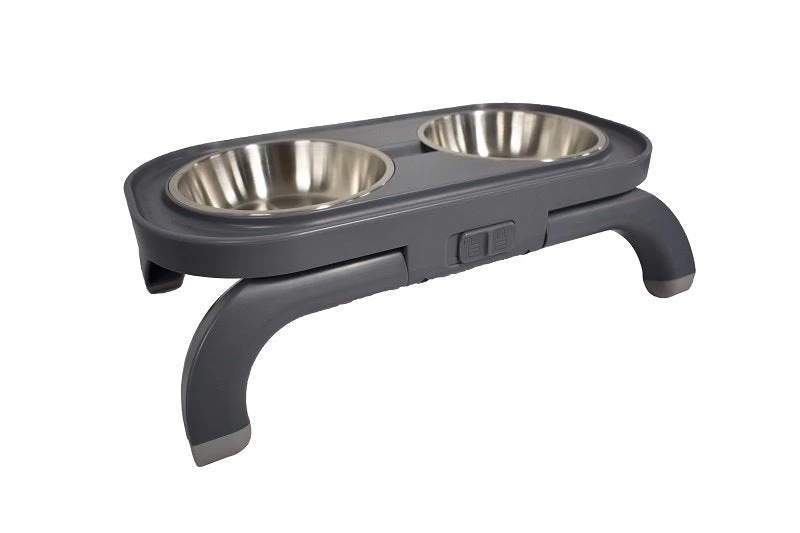 These pet bowls feature folding legs that lock for space saving storage while travelling and height adjustment when in use.